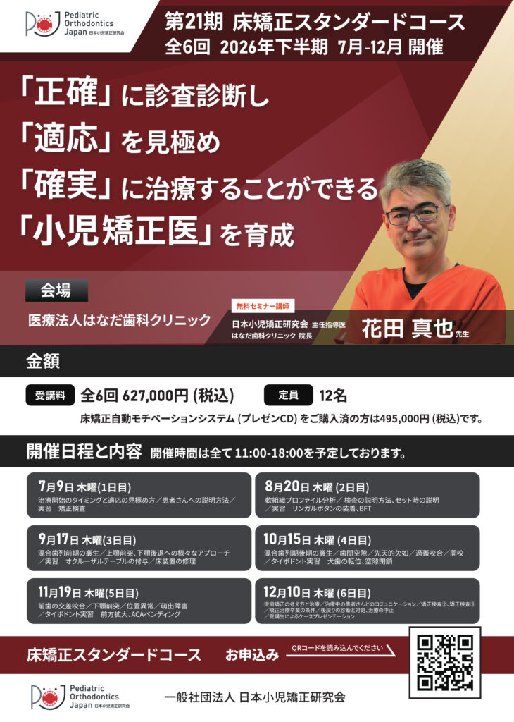 講師は日本床矯正研究会 指導医の花田真也先生です。受講することで、日本床矯正研究会への入会資格も得られます。